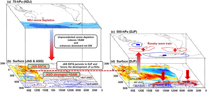李双林研究员继续解释道:“由于平流层臭氧破纪录减少,使得前者维持历史最强或接近最强;而后者持续到2022年夏季,有利于拉尼娜的发生发展,最终在赤道西南太平洋激发向西南极方向传播的罗斯贝波。阿蒙森低压在二者协同的影响下,加深并向西南偏移,有利于西南极海冰减少。”