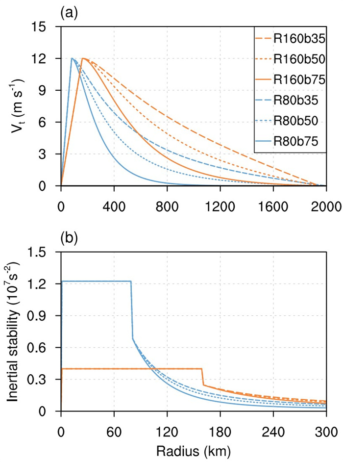 中国科学院大气物理研究所LACS中心的陈光华研究团队利用中尺度数值模式(WRF)开展了一系列理想试验,讨论了初始风场结构对涡旋在发展阶段中尺度-强度关系的影响,定量比较了初始风场结构中的两个关键参数(最大风速半径RMW和RMW外风速衰减速率b)的相对作用(图1),最后对不同参数影响的物理过程进行了讨论。