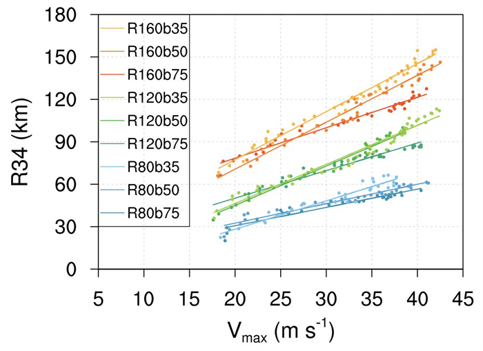 不同于前人研究大多仅讨论热带气旋尺度或强度的变化,本研究将尺度-强度关系作为研究对象进行讨论,能够增进我们对整体风场结构变化背后物理过程的认识。该研究结果强调了对初始风场结构的准确模拟在提升对热带气旋整体风场结构变化预报能力中的重要性。