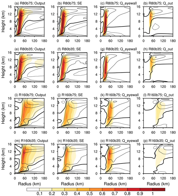 RMW和风速衰减速率b分别与涡旋中眼墙对流和外区对流的发展密切相关。该研究利用切向风方程和Sawyer-Eliassen方程,分别计算了涡旋风场对眼墙对流和外区对流所释放的非绝热加热的平衡响应程度(图3)。