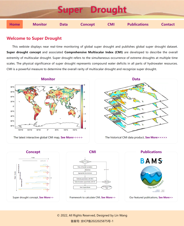 成果从根本上革新了对于干旱中极端事件的认知,建立的原创CMI指数具有广泛的应用前景,并力争提升我国在干旱指数和干旱监测领域的国际影响力。同时,为了促进成果的转化应用,建立了在线产品平台superdrought.com,发布逐月全球超级干旱监测信息和历史数据集,更好的服务于干旱科学研究和监测业务实践。