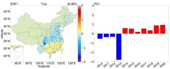 该研究发现,夏季地闪第一模态的方差贡献率为32.86%,其分布从北到南呈现出“-+-”的经向跷跷板模式(即:空间模态分布特征——华北和广东南部地区夏季地闪活动减少,而华南夏季的地闪活动增强)。