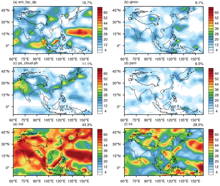 图1. 四个通过90%显著性检验的参数对亚洲夏季降水的相对贡献(Cj)(阴影;单位:%)(a-d)。四个参数对亚洲降水的相对贡献之和(Cind)(阴影;单位:%)(e)。相互作用的两个参数对亚洲降水的贡献之和(Cint)(阴影;单位:%)(f)。右上角的数字表示区域平均值。