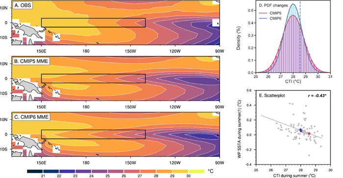图1 观测(A)、CMIP5模式(B)和CMIP6模式(C)中夏季热带太平洋背景气候态海温分布,模式中存在显著的冷舌偏差。图D展示了CMIP5和CMIP6模式中冷舌指数的概率密度函数分布,图E展示了夏季赤道太平洋冷舌指数与El Nino次年夏季西太平洋区域平均海温异常之间的模式间散点图,这表明模式中西太平洋增暖异常的长期维持可能和背景气候态冷舌偏差有关。