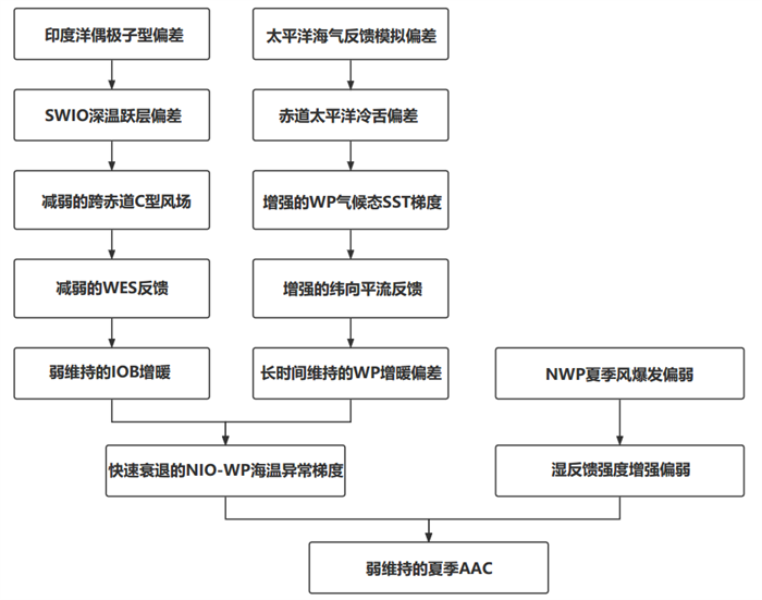 针对上述问题,中国科学院大气物理研究所黄刚课题组开展了相关研究。基于45个CMIP6模式和36个CMIP5模式,研究指出在CMIP5/6模式中模拟的El Nino次年夏季西太反气旋持续性较弱,这与观测中西太反气旋的夏季季节内增强并不对应。模式中夏季西太反气旋的弱持续性偏差可能源于北印度洋和西太平洋之间海温异常梯度的弱持续性。一方面,模式中El Nino次年夏季北印度洋增暖衰减速度过快,这可能源于印度洋上空减弱的跨赤道反对称风场模态和风-蒸发-海温反馈,该偏差可能可以进一步追溯到CMIP模式中西南印度洋的深温跃层偏差。另一方面,模式中存在长期维持的西太平洋增暖偏差,这可能源于热带西太平洋增强的上层海洋纬向平流反馈和风-下沉流-海温反馈,该偏差可以进一步追溯到CMIP模式中的赤道太平洋冷舌偏差。