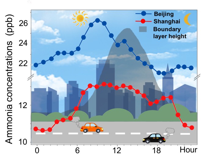 2020年5月观测结果发现,北京大气氨平均浓度(23.1±10.3 ppb)接近上海(12.0±5.0 ppb)的两倍,与卫星观测的氨气柱浓度和自下而上统计的氨气排放量的空间分布一致。研究还发现两个城市同时存在氨气早高峰现象,其发生频率大于50%,机动车排放是导致氨气浓度早高峰形成的主要原因。早晨边界层打破后,随着对流发展,富含氨气的残留层向下传输也对早高峰有一定贡献。上述结果促进了我们对城市大气氨浓度动态变化特征及背后驱动因素的科学认识,其高频观测数据可用于提升大气化学传输模型的模拟精度,有助于评估大气氨污染的生态环境效应并为氨减排策略的制定提供参考。