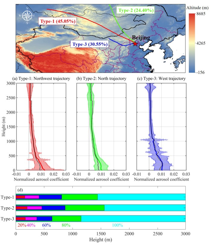 图1. 上图代表不同来源轨迹聚类。(a)-(c)为三种轨迹控制下归一化气溶胶系数廓线。(d)代表三种气团控制下20%、40%、60%、80%气溶胶层所在高度。