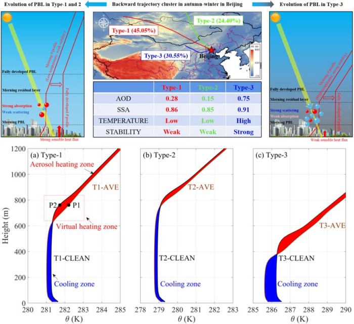 我所LAPC国家重点实验室辛金元研究员、马永敬博士等合作者基于北京城市大气污染边界层理化结构多年观测,利用高分辨率边界层大涡模型,系统分析了不同来源气溶胶对北京城市边界层的反馈过程。聚类分析2016-2019年秋冬季节气团轨迹,北京地区主要受三类气团控制:Type-1西西伯利亚平原气团、Type-2中西伯利亚高原气团和Type-3蒙古高原气团。三类气团控制下局地气溶胶理化特性、垂直分布和大气边界层结构差异显著。在Type-1和Type-2气团控制下,气溶胶光学厚度分别为0.28±0.26和0.15±0.08,其中80%集中在1500m以下;同时,两类气团控制下大气热力层结不稳定,大气扩散能力较好。Type-3气团控制下气溶胶光学厚度和单次散射反照率分别为0.75±0.54和0.91±0.05,表明含有大量散射性气溶胶且污染程度严重;在该类气团控制下,大气更为稳定,大气扩散能力较差,80%的气溶胶分布在1150米高度范围内。利用不同气团的大气热力层结与气溶胶约束驱动大涡模式,模拟发现不同源区气溶胶均对边界层产生抑制作用。边界层高度从清洁条件的1120m(Type-1)、1160m(Type-2)、820m(Type-3)分别下降到污染情景的980m、1100m和600m。研究发现,残留层之下吸收性气溶胶的“火炉效应”对边界层的促进作用较弱,很大程度上被残留层之上吸收性气溶胶“穹顶效应”和整层散射性气溶胶的“阳伞效应”所抑制。而在未来减排情景下,城市地区的气溶胶-边界层相互作用仍存在很大的不确定性。