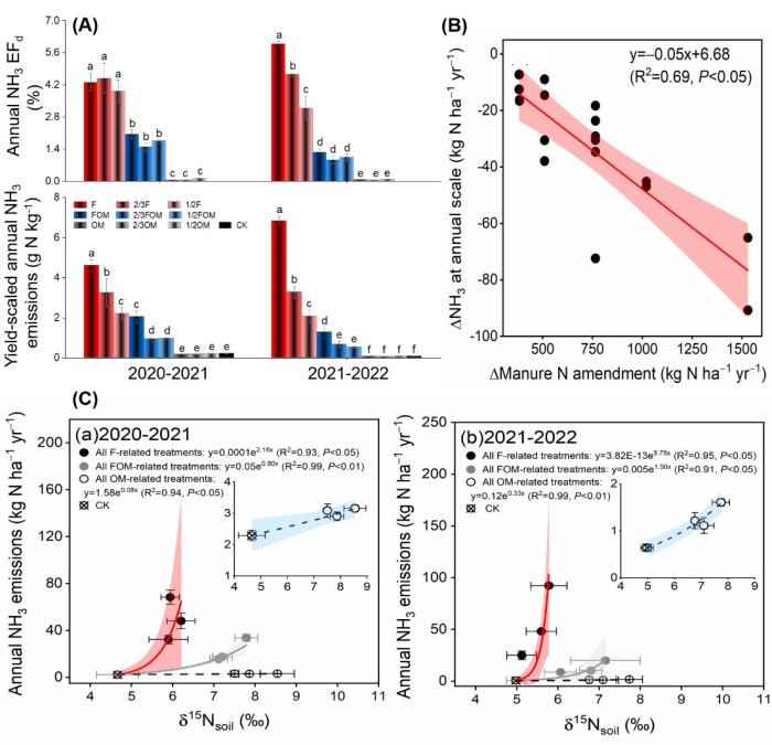 图1. 在 2020-2022两周年观测期内,辣椒-莴笋-莲花白轮作系统不同施肥处理下NH3年直接排放系数(EFd)和单位产量的NH3排放强度(A);施加有机肥导致的NH3年排放变化量(ΔNH3)与相应有机氮施加量变化(Δ有机氮)之间的关系(B);NH3年排放量与土壤δ15N之间的关系(C)。CK:不施肥、F:单施尿素、2/3F:减氮30%+单施尿素、1/2F:减氮50%+单施尿素、OM:单施有机肥、2/3OM:减氮30%+单施有机肥、1/2OM:减氮50%+单施有机肥、FOM:尿素+有机肥配施、2/3FOM:减氮30%+尿素+有机肥配施、1/2FOM:减氮50%+尿素+有机肥配施。
