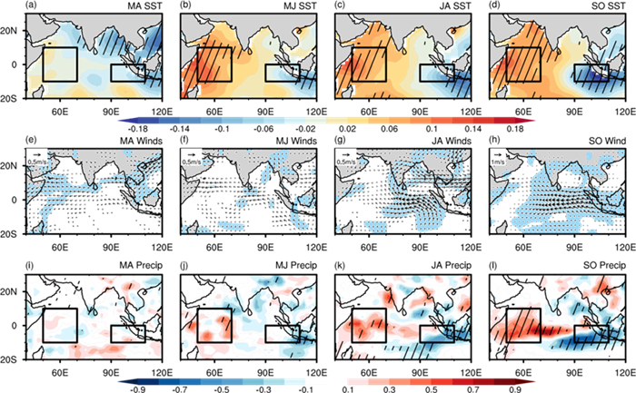图1 春季AO指数回归的春季到秋季的印度洋海温场,风场,降水场的演变