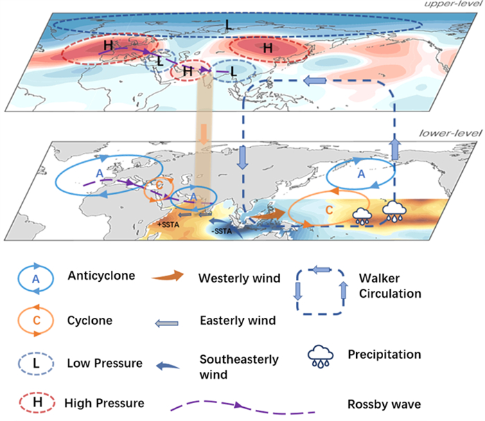 这项研究揭示了北半球春季的北极涛动(AO)对随后的秋季IOD有显著影响。当春季AO处于其正(负)位相时,随后的秋季倾向于出现正(负)IOD。进一步研究了春季AO对秋季IOD影响的可能物理过程:正位相的春季AO伴随着北大西洋上的一个偶极子降水异常,高纬度区域表现为降水正异常,中纬度区域为降水负异常。北大西洋中高纬度区域的大气加热异常进一步引发了从北大西洋到印度洋的大气波列,导致热带北印度洋上出现明显的东风异常(图1e)。这些东风异常可以通过调节海表热通量和海洋热量传输,在热带西印度洋(WTIO)引起海表温度(SST)正异常。WTIO的暖海温异常持续到随后的秋季,在赤道印度洋中增加了SST异常的纬向梯度,并导致该区域出现东风异常(图1b,c,g)。此外,赤道印度洋的东风异常可以通过引起冷水上翻从而在东南热带印度洋(SETIO)引起冷SST异常。同时,先前的研究表明,正位相的春季AO可能会导致随后夏季热带中太平洋出现显著的正降水异常(图2)。我们的结果显示,热带中太平洋上的异常对流可以通过异常的Walker环流增强苏门答腊西海岸的东南风异常,这也对SETIO的冷SST异常起到了一定作用(图2)。因此,春季AO可能通过上述过程对随后的秋季IOD产生重要影响,并可作为IOD事件的潜在预测因子。