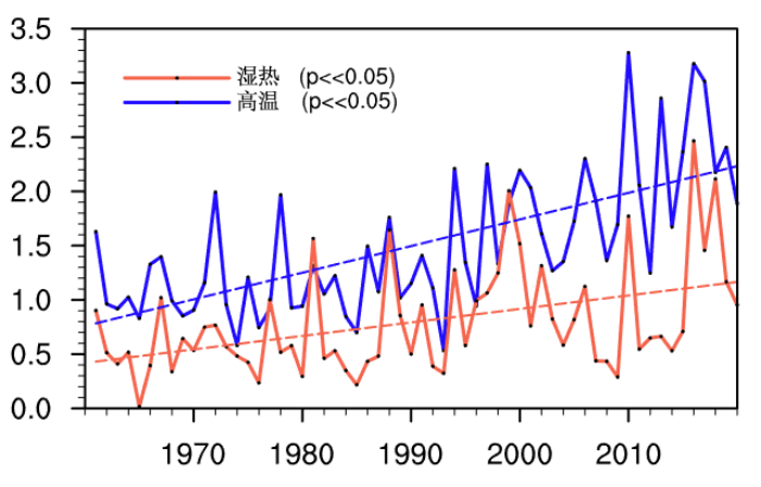 图:1961-2020年中国极端高温事件(蓝色实线)和极端湿热事件(红色实线)频次的时间序列,虚线表示线性趋势。