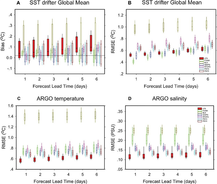 图1 LFS预报SST与漂流浮标观测的(A)偏差(Bias)和(B)均方跟误差(RMSE),以及预报的(C)温度和(D)盐度相对于ARGO廓线的均方根误差(RMSE),随预报时效的变化。其中横坐标为预报时效,方块代表95%百分位数的范围。