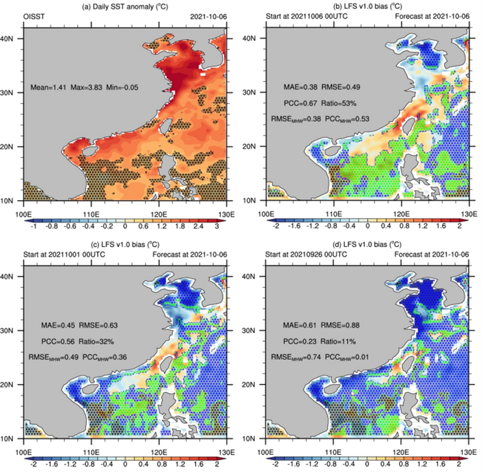 图2 OISST观测和LFS预报结果中SSTA和海洋热浪事件的比较。(a)2021年10月6日OISST的SSTA(填色)和海洋热浪事件的发生(未打点)。SSTA是相对于OISST 1982年至2021年期间的气候日均SST的差异。(b-d)LFS预报结果中的SSTA偏差(填色)以及提前1天、6天和11天预报的命中(未打点)、误报(绿色打点)、漏报(蓝色打点)和正确不报(黑色打点)。图中MAE、RMSE、PCC和Ratio分别为OISST和LFS之间的面积加权的平均绝对偏差、面积加权的均方根误差、空间相关系数以及正确预报的海洋热浪事件与OISST中热浪事件之间的面积比率。