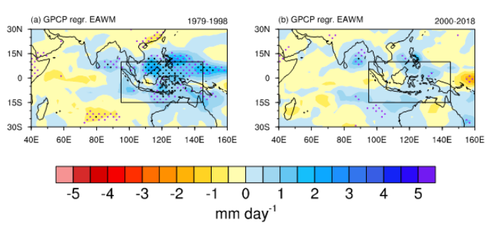 图1. 标准化的东亚冬季风指数回归的(a)1979-1998和(b)2000-2018年间的冬季降水场。紫色和黑色打点分别表示超过95%和99%显著性检验的值,黑框表示海洋性大陆地区。