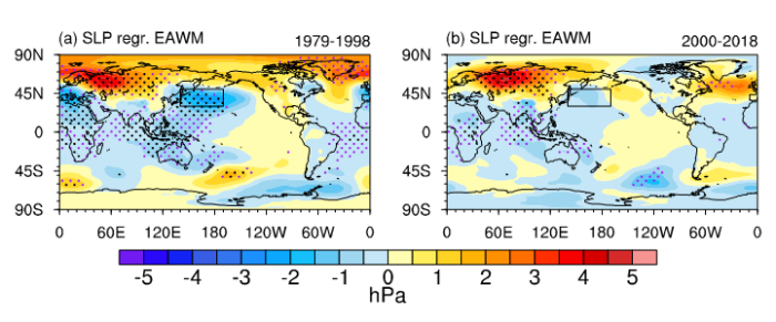 图2. 标准化的东亚冬季风指数回归的(a)1979-1998和(b)2000-2018年间的海平面气压场。紫色和黑色打点分别表示超过95%和99%显著性检验的值,黑框表示阿留申低压区域。