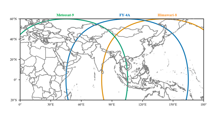 图1. 中国风云4A(FY-4A)、日本葵花8(Himawari-8)和欧洲(Metesat-9)静止气象卫星空间覆盖示意图