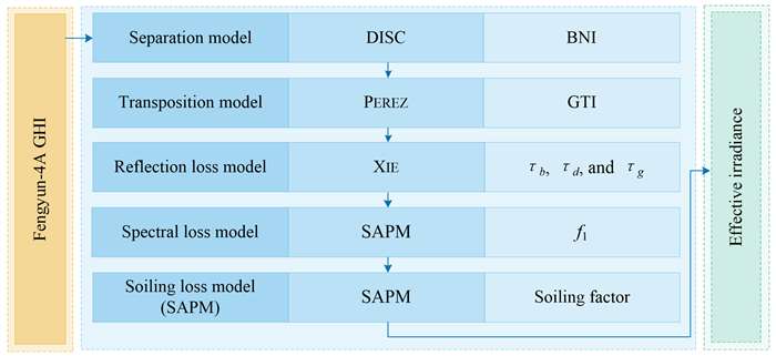 近日,中国科学院大气物理研究所施红蓉博士等联合哈尔滨工业大学能源科学与工程学院和中国气象局卫星气象中心合作者,利用风云四号A星(FY-4A)光谱成像仪数据,结合机器学习方法构建了中国地区高时空分辨率(4km/15min)地表太阳辐射数据集,进一步基于光伏模型链(图2),获得了中国地区光伏有效辐射资源分布图(图3),表明中国西北地区最大年有效辐射能超过1700 kWh/m2。本研究工作表明新一代静止气象卫星在太阳能资源评估中的广阔应用前景,有望显著促进我国光伏太阳能能源发展和利用。