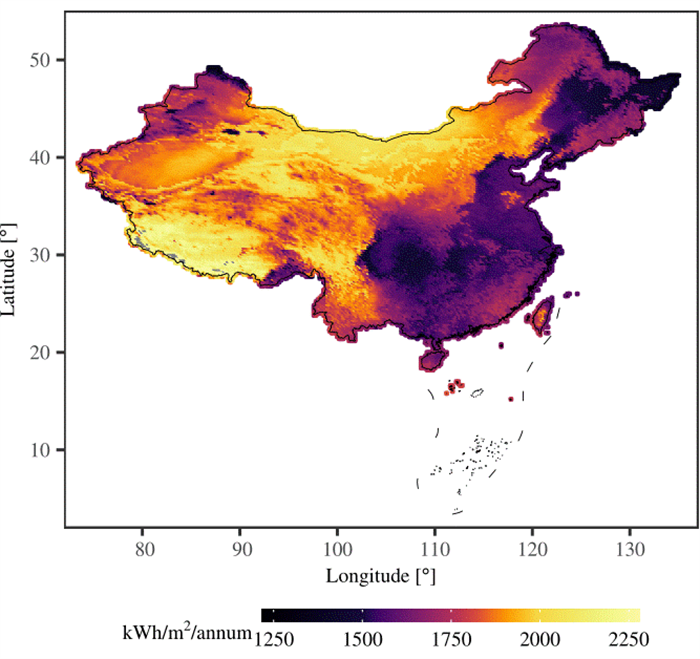 图3. 中国地区2018年光伏分布图(kWh/m2/annum)