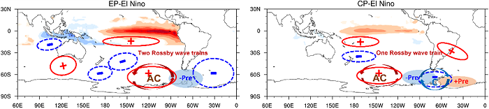 在东部型事件期间,热带太平洋和热带印度洋各激发一支罗斯贝波列,两支波列向东南方向传播并汇合于西南极,在罗斯-阿蒙森-别林斯高晋海和威德尔海上空分别激发出一个异常反气旋和气旋,别林斯高晋和威德尔海受南风异常控制,使得降水减少;在中部型事件中,仅存在一支振幅较弱且位置偏西的罗斯贝波,罗斯海-阿蒙森海和别林斯高晋-威德尔海分别被异常反气旋和气旋控制,阿蒙森-别林斯高晋海盛行南风异常,有利于降水减少,而气旋东侧的异常偏北风可将低纬度暖湿空气向南输送,有利于威德尔海降水增加。