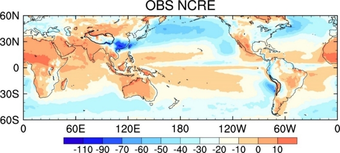 图1. CERES卫星资料观测所得2001-2014年3-4月平均的大气顶净云辐射效应(W m-2)。