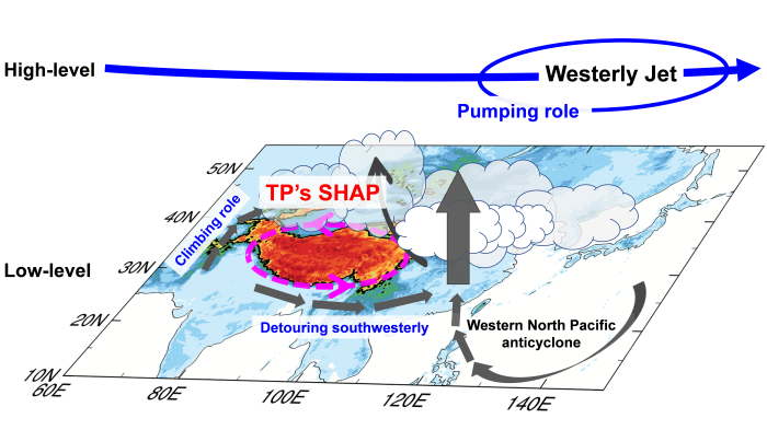 图2. 青藏高原大地形影响春季东亚区域云量示意图。图中TP指青藏高原,SHAP指地表感热气泵效应。