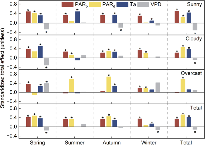 图2 各季节不同天气条件下环境变量对净生态系统生产力(NEP)的标准化总效应。其中,PARd、PARb、Ta和VPD分别表示散射光合有效辐射、直接光合有效辐射、气温和饱和水汽压差。符号(*)表示p < 0.05。
