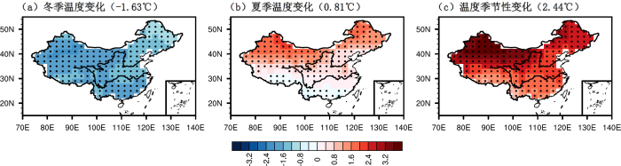 图:相对于工业革命前期,16个模式平均模拟的中全新世中国(a)冬季温度、(b)夏季温度和(c)温度季节性(即夏季与冬季温差)变化(℃);括号内数值为中国区域平均值,打点区为70%以上模式与多模式平均变化符号一致的区域。