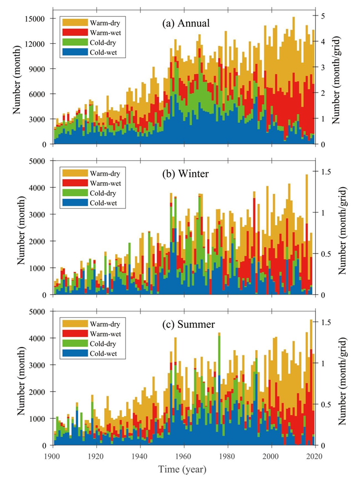近日,中国科学院大气物理研究所赵亮高级工程师、凌健研究员与清华大学黄存瑞教授联合国家卫星气象中心王劲松研究员和南京信息工程大学沈新勇教授等系统性地研究了中国近百年来气温-降水复合极端事件的时-空变化规律及其年代际特征,从气候变化、年际变化和极端事件耦合性的角度评估了影响中国复合极端事件多尺度变化的主导因子。
