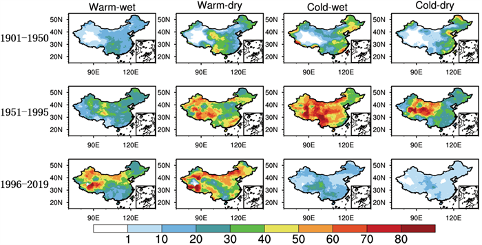 结果表明,四种类型气温-降水复合极端事件的总频数总体上呈上升趋势(图1),可以分为三个阶段:1950之前、1951-1995年和1996-2019。1901-1950年暖干和暖湿事件增加;1951-1995年期间冷性事件(冷湿和冷干)相对频繁,冷湿事件是这一时期主导类型。1996年之后暖性复合事件(暖湿和暖干)快速增加,占据主导地位,其中暖湿事件在青藏高原和西北地区频繁出现,暖干事件主要集中在西南和华北地区。