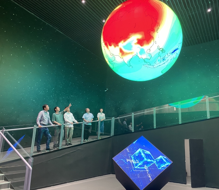 图3 CAS-ESM团队在地球系统数值模拟装置可视化球屏前讨论全耦合大气CO2季节变化的模拟结果(摄影:李国强)