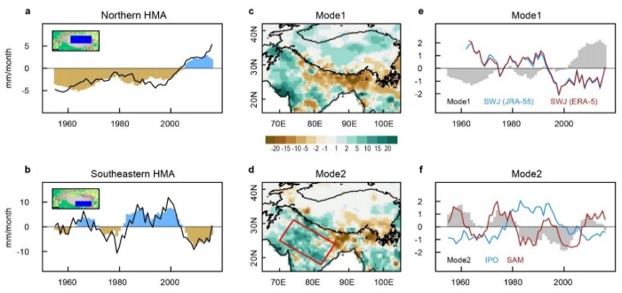 以青藏高原为主体的亚洲高山区陆地水储量的变化具有明显的空间异质性,受到降水变化的显著影响。观测资料显示,亚洲高山区夏季降水呈现出“双核型”的长期变化态势——即北部增多、南部减少。为了明晰上述降水型式变化的驱动因子,研究团队首先揭示出主导该地区夏季降水年代际以上时间尺度变化的两个模态——“西风相关模态”和“季风相关模态”。在第一模态中,高原北部和南部降水呈现相反的变化:当高原北部降水增多时,南部降水减少。这一模态与欧亚大陆上空西风急流强度的变化密切相关,故被称为“西风相关模态”,该模态从20世纪50年代以来一直呈增强态势。在第二模态中,高原东南部和南亚降水呈现反相变化:当南亚季风降水增多时,高原东南部降水减少,这一模态被称为“季风相关模态”,它存在十几至几十年的年代际波动。