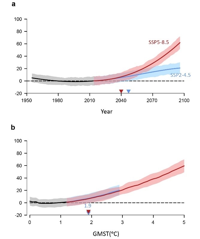 研究团队进一步计算了人为活动引起的高原增湿在何种情形下会超过气候系统内部变率的影响。研究发现,在SSP2-4.5和SSP5-8.5排放情景下,当全球平均温度较之工业化前的升温达到约1.9 时,人类活动的影响将超越气候系统内部变率的影响,从而主导高原东南部夏季降水变化。