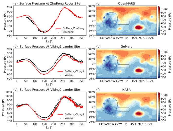 图1. GoMars和NASA模式模拟的地表气压与祝融号、维京1号、2号观测资料以及OpenMARS再分析资料的对比。祝融号火星车(a)、维京1号(b)、维京2号(c)着陆器观测(黑点)及GoMars模式模拟(红线)地表气压(单位:Pa)随太阳经度(Ls)演变的时间序列;(d)OpenMARS资料,(e)GoMars及(f)NASA模拟的年平均地表气压空间分布。蓝色椭圆和长方形分别对应塔尔西斯高原、水手峡谷;红色五角星及蓝色圆点分别对应祝融号火星车、维京1号(西)、维京2号(东)所在位置。