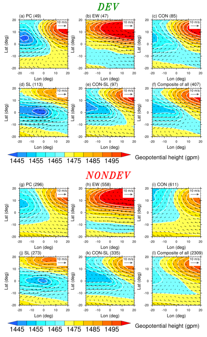 由ERA5再分析资料的低层风场识别出2000-2019年6-11月的407个发展扰动(DEV)和2309个不发展扰动(NONDEV),并分别划入上述五型(图1)。统计表明,SL和CON-SL最有利于扰动发展,而EW相对不利。合成分析显示DEV比NONDEV在南侧具有更强的背景西风,DEV在生成前24小时快速加强,而NONDEV在其生命史最强时刻前24小时只有微弱加强。