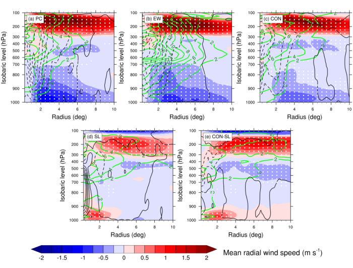 图2 五个环流型中发展扰动与不发展扰动的方位平均径向风速(填色)、相对湿度(绿色等值线,单位:%)和垂直速度(黑色等值线,-0.3 - 0.2,间隔0.025,虚线为负值,单位:Pa s-1)之差。原点为扰动中心,白点表示发展与不发展扰动的差异通过了95%的显著性检验