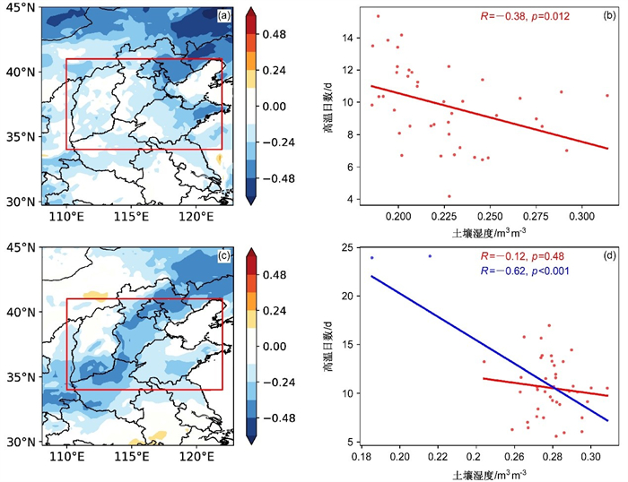 图1 1981~2020年(a、b)ERA5数据、(c、d)控制试验5月次表层(第二层)土壤湿度与夏季高温日数相关系数空间分布(左列)和华北地区(红框区域为本文定义的华北地区范围)区域平均的6月次表层土壤湿度与7月高温日数之间的关系(右列)。在40年的控制试验中,有两年的土壤湿度异常明显偏离其他年份,导致整体6月次表层土壤湿度与7月高温日数存在较强相关(蓝色拟合线及参数)。如果不考虑这两个年份,则两者的相关系数不再显著(红色拟合线及参数)。图1c不包含图1d中两个蓝色点年份数据