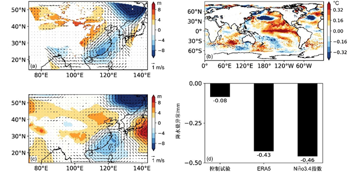 图2 (a)控制试验;(c)ERA5资料高异常年和低异常年7月850 hPa位势高度场和风场差异的空间分布;(b)ERA5资料中高异常年和低异常年7月海温差异的空间分布;(d)控制试验和ERA5资料中高异常年和低异常年华北地区区域平均的7月降水量差值及根据Nino3.4指数判定的热带中东太平洋海温暖异常年和冷异常年华北地区区域平均的7月降水量差值