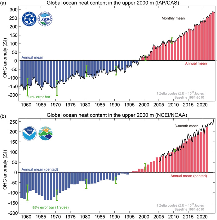 图2. 1958-2023年全球海洋上层2000米热含量变化时间序列:上图为IAP/CAS数据、下图为NOAA/NCEI数据。