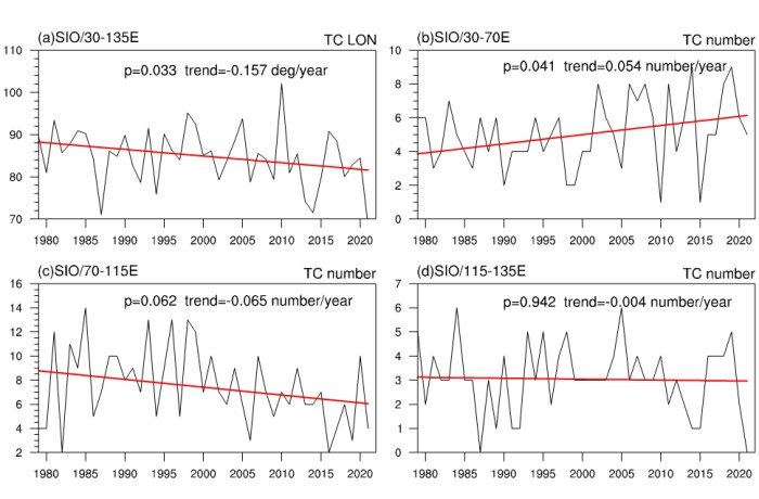图1. (a)整个南印度洋热带气旋生成的年平均经度的时间序列,(b-d)和(a)类似,但为南印度洋的西边区域(30 -70 E),中间区域(70 -115 E)和东边区域(115 -135 E)的热带气旋频数的时间序列。红色直线为线性趋势,图上方为趋势的信度和趋势的大小。