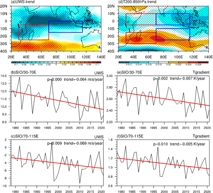 图2. (a)垂直纬向风切变和(d)对流层平均的温度的线性趋势。图(b)表示图(a)中红色区域垂直纬向风切变的时间序列,图(c)表示图(a)中蓝色区域的垂直纬向风切变的时间序列;图(e)表示图(d)中热带红色区域和副热带红色区域的对流层温度差值的时间序列,图(f)表示图(d)中热带蓝色区域和副热带蓝色区域的对流层温度差值的时间序列,图(b-c, e-f)中红色直线为线性趋势,图上方为趋势的信度和趋势的大小。