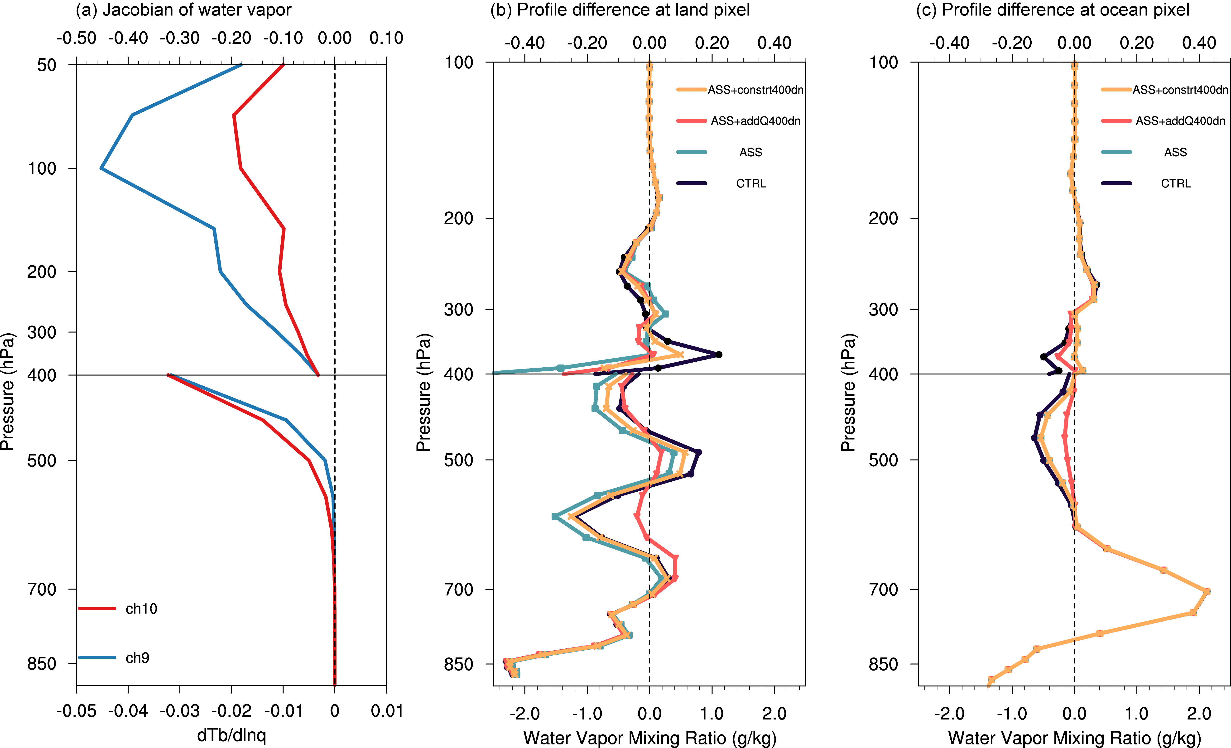 1. NR试验与CTRL试验和ASS试验的水汽雅可比和水汽廓线的差值。(a)AGRI通道910的水汽雅可比函数的垂直分布。(b)NR试验的水汽廓线-CTRL试验的水汽廓线(单位:g kg-1;黑线)、NR试验的水汽廓线-卷云同化试验的水汽廓线(单位:g kg-1;蓝线)、NR试验的水汽廓线-卷云ASS+addQ400dn同化试验的水汽廓线(单位:g kg-1;红线)和NR试验的水汽廓线-卷云ASS+constrt400dn同化试验的水汽廓线(单位:g kg-1;橙线)在陆地视场上的垂直分布。(c)(b)相同,但为海洋视场的单点结果。由于垂直方向水汽量级差异较大,本图以400hPa高度为分界线,上下采用不同的x坐标轴。
