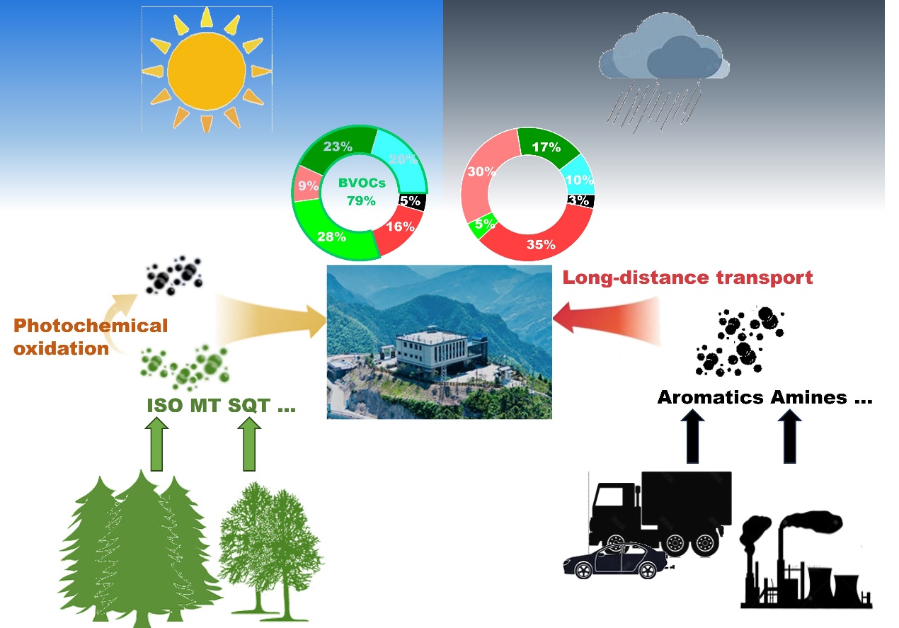 研究结果显示,含氧挥发性有机化合物(OVOCs)是VOCs的主要组成,平均贡献达到74%,其浓度受气象和光化学过程显著影响,尤其是在晴天和云雾天过程中表现出很大差异。与生物源排放相关的有机分子,如异戊二烯、单萜烯和倍半萜烯等,在晴天的浓度为云雾天的2.4-2.9倍;而云雾天期间与人为源排放相关的VOCs,如苯和甲苯等浓度较高。此外,晴天时期,乙醛、MVK + MACR、丙酮和MEKOVOCs的浓度也较高,说明了光化学氧化生成是生物源OVOCs的重要来源。