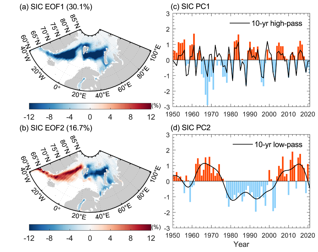 图1 在1950-2021冬季(DJF)欧亚北极地区海冰密集度(SIC)的EOF模态及主成分时间序列。a-d为冬季平均的SIC的第一(a)和第二(b)模态及其对应的第一(c)和第二(d)主成分,黑线分别为10年高通(低通)滤波的时间序列,它表示海冰的年际(年代际)变化。