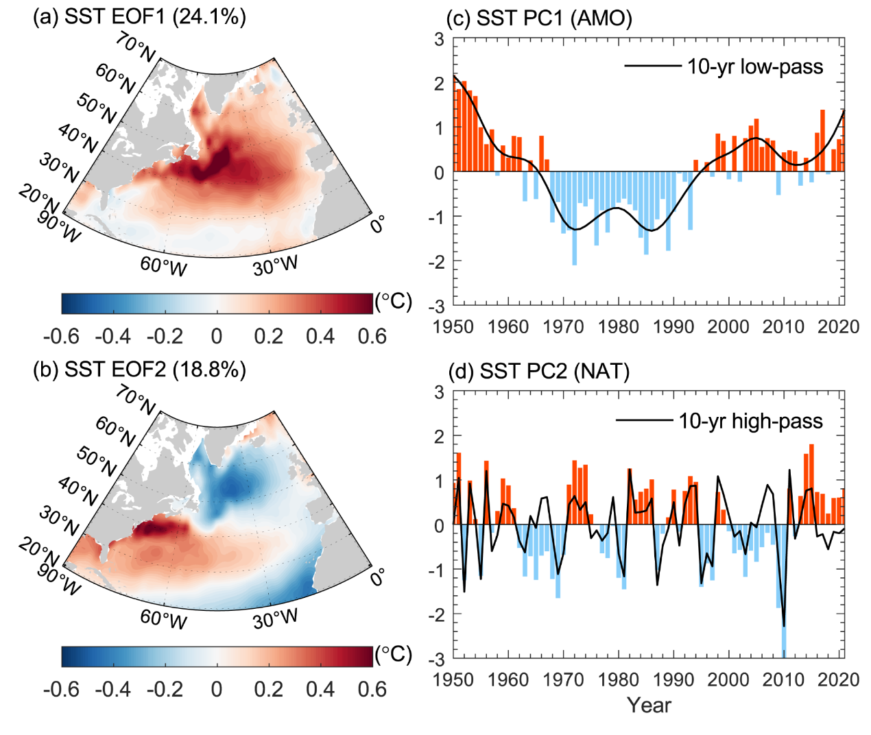 图2 在1950-2021冬季北大西洋SST的EOF模态及主成分时间序列。a ,b 为SST的第一和第二模态;c ,d为第一和第二主成分时间序列,黑线表示10年低通、高通滤波后的时间序列,其中10年低通滤波的SST PC1可视为年代际尺度的AMO,而10年高通滤波的SST PC2可看作年际尺度的NAT。