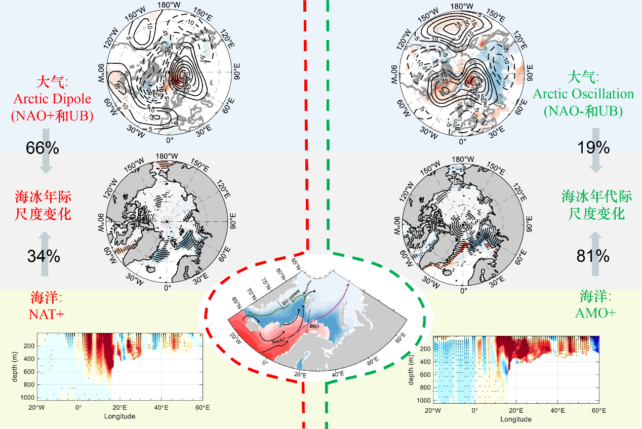 图3 欧亚北极地区海冰年际-年代际变化的示意图。第2行为海冰年际(左)和年代际(右)尺度变化的空间特征。第1、3行分别是与海冰变化相关的大气环流和海洋热输送,其中第1列是海冰年际变化的示意图,第2列是海冰年代际变化的示意图,中间为北大西洋进入北极地区的洋流示意图。图中百分数表示1960-2017年大气过程和海洋过程对海冰年际、年代际变化的贡献率。