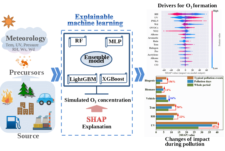 集成机器学习模型结合SHAP解析影响臭氧形成的驱动因素示意图