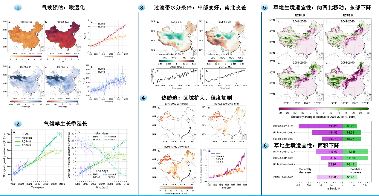 我国气候历史和未来两个时期总体上气候暖湿化的背景下,干湿气候过渡带是水热环境变化影响最为显著的区域。到21世纪末,植被的生长季长度延长达60天,但30%的区域将面临热胁迫的影响。从大气和土壤两方面来看,水分条件除过渡带中部地区外,总体上也更不利于植被过程。随着生物学气候水热条件的演变,过渡带主导生态系统草地的适宜性区域向西北方向移动,这与西北暖湿化和草地生态系统东部边缘的水热胁迫,或者部分地区水热条件转好后更适宜于其它植被生态系统有关。总体上,草地的生境适宜性下降的区域达到了131万平方公里,约占2006-2010年面积的46.6%,虽然生境适宜性下降并不完全导致草地生态系统的退化,但一定程度上会抑制其发展,对长期的可持续性造成威胁。这一发现对我国气候过渡带的未来水资源利用、环境保护和可持续发展提供了参考依据。