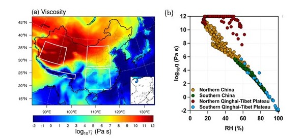 图1. (a)我国2018年夏季地表面SOA的粘度。(b)图a所示四个区域内SOA粘度随相对湿度的变化。