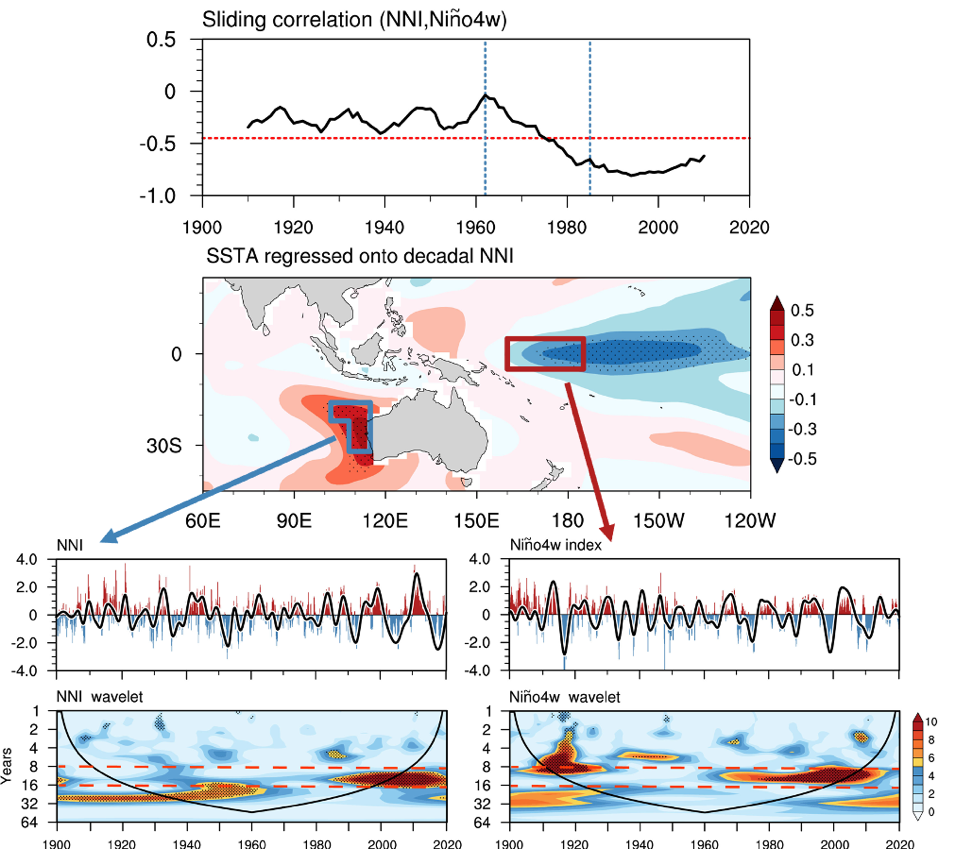 澳大利亚西部沿岸频繁遭遇海洋热浪,导致珊瑚白化事件增多,严重影响当地海洋生态系统。同时,热带中西太平洋是连接热带印度洋和太平洋、指示出现厄尔尼诺-南方涛动(ENSO)或者太平洋年代际振荡(IPO)的关键区域,其变化对全球天气和气候影响巨大。近期发表在《Nature Communications》上的一项研究,揭示了澳大利亚西部沿岸与热带中西太平洋这两个区域之间存在显著增强的年代际联系,为深入分析海盆间相互作用提供了关键信息。